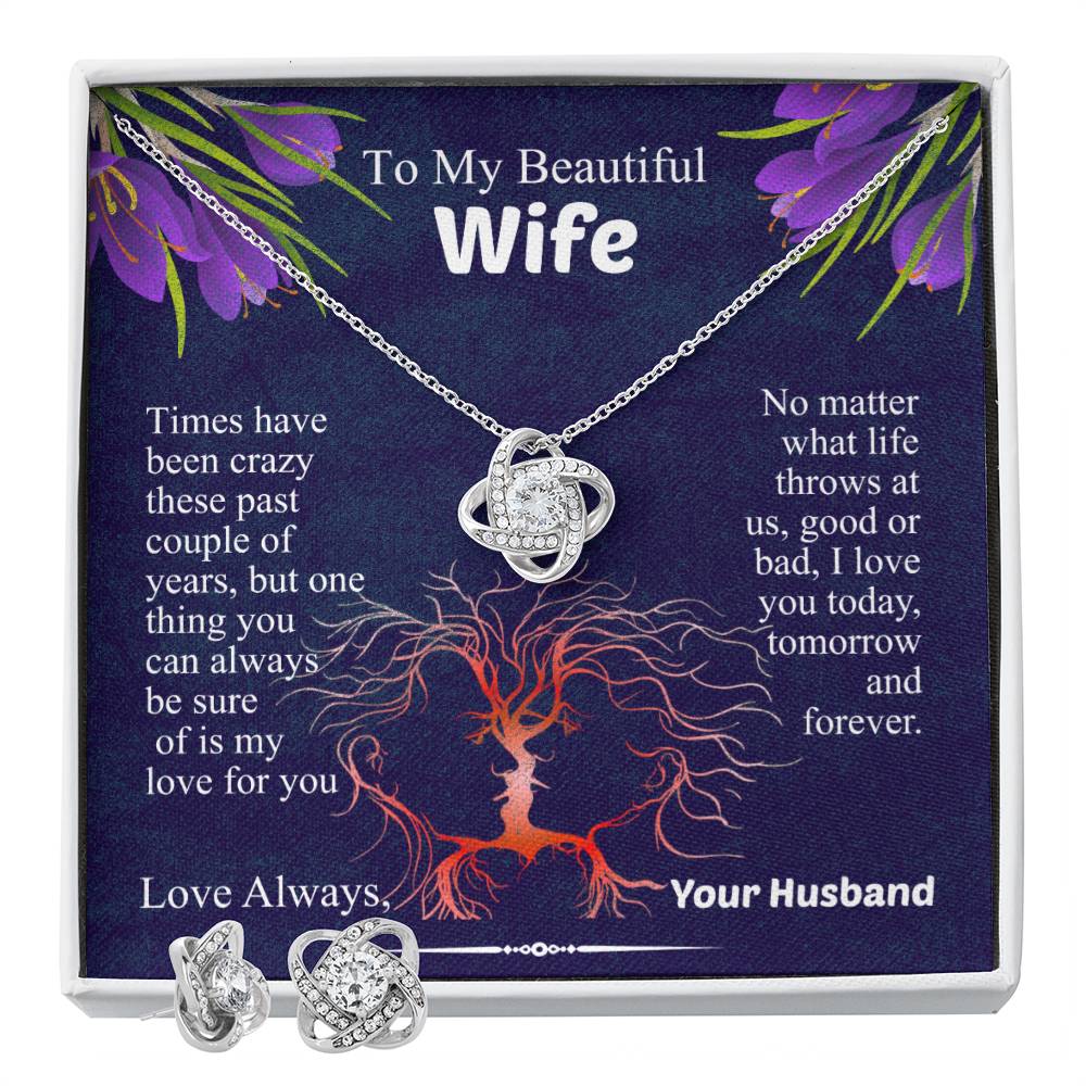To My Beautiful Wife Love Knot Necklace & Earring Set, Necklace for Wife, Anniversary Gift for Wife, Wife Birthday Gift, Message Card Jewelry