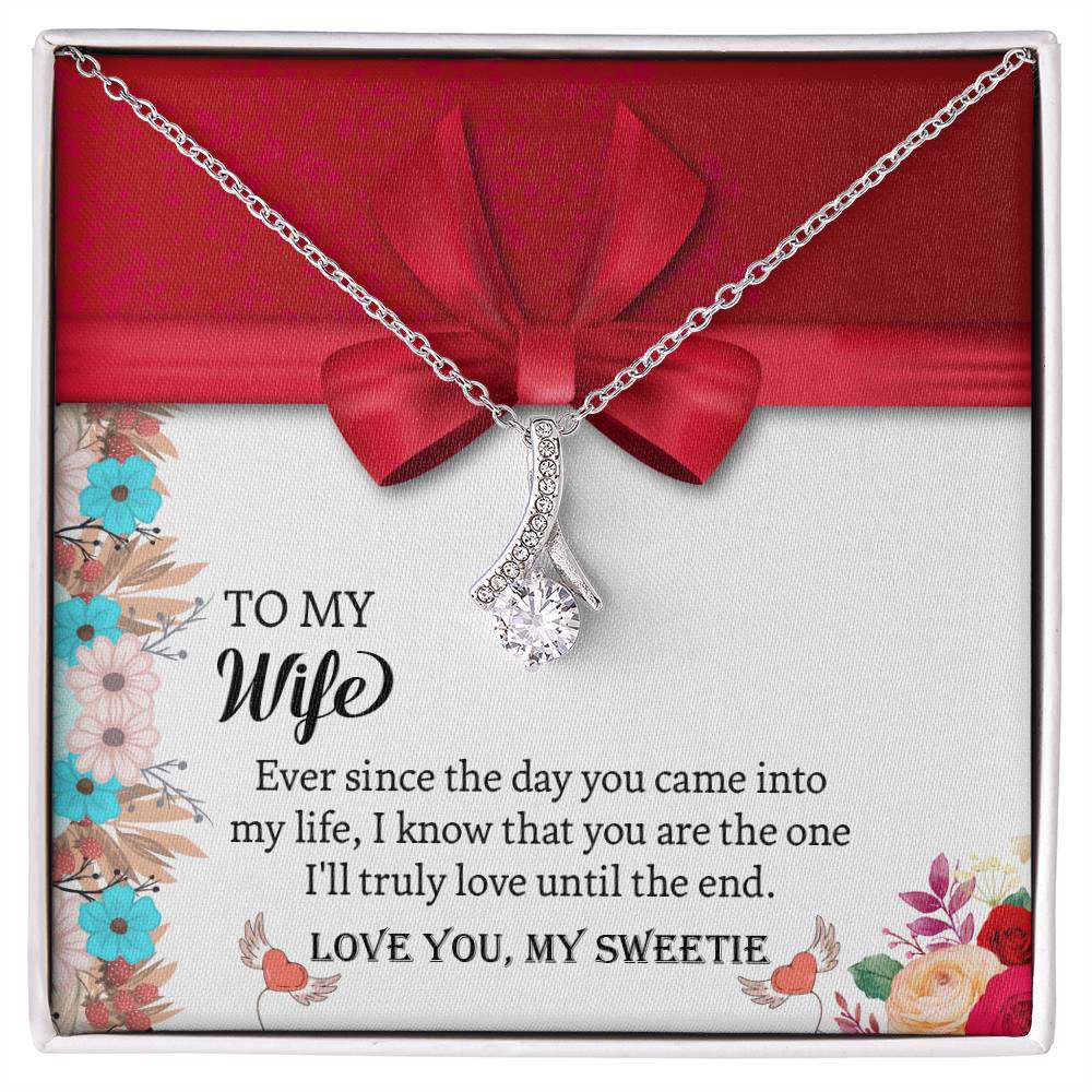 Imagine her reaction when she opens this stunning gift! The Alluring Beauty necklace features a petite ribbon shaped pendant that is sure to dazzle your special someone. Whether it's a birthday or anniversary, make sure to get her a gift she will love for years to come.